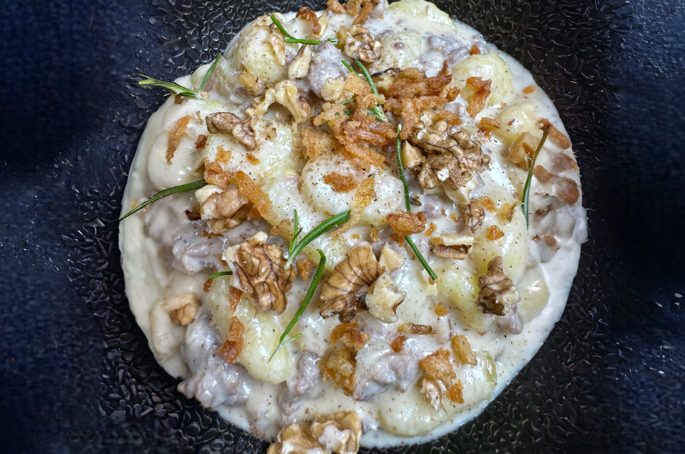 - Salta il tutto in padella e, a fuoco spento, aggiungi la crema di noci.