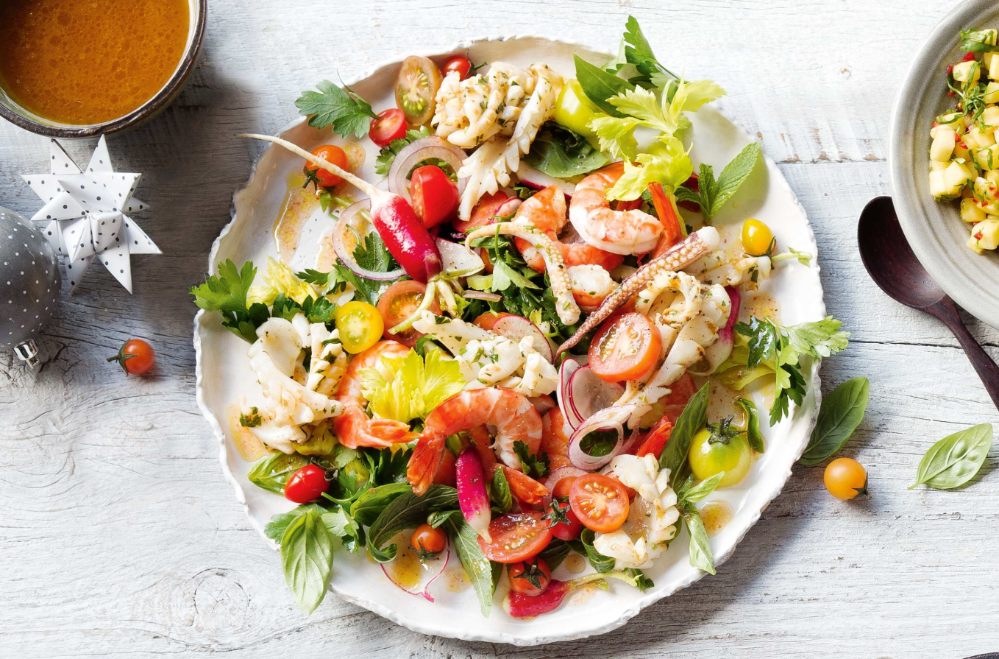 - Assembla l'insalata: In una ciotola grande, unisci il polpo, le cozze, i calamari, i gamberetti, la rucola e i pomodorini.