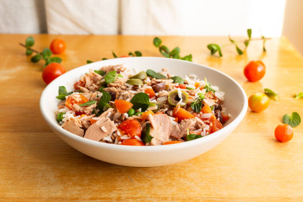 - In una ciotola capiente, unisci il riso raffreddato con una quantità equivalente di tonno sgocciolato.
