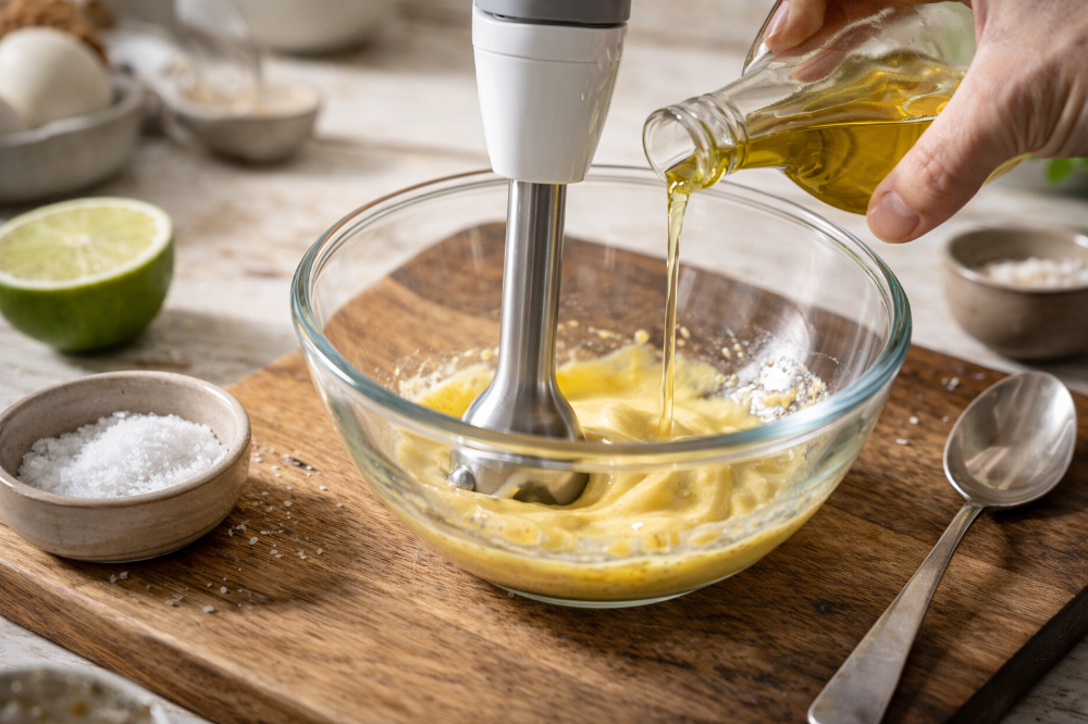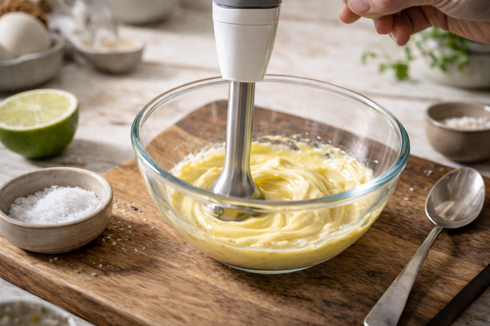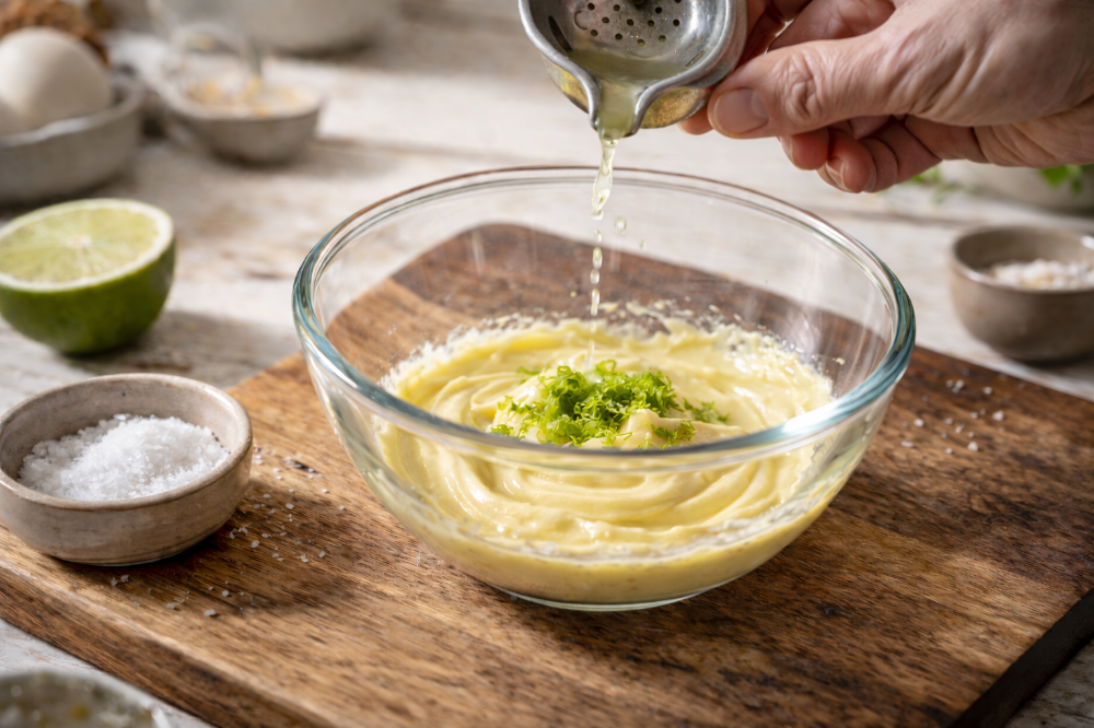 Maionese al lime pronta in pochi minuti, dal gusto fresco e agrumato e dalla consistenza densa e cremosa. Si parte mettendo in una ciotola il tuorlo con sale e senape, poi si monta con frusta o frullatore a immersione versando l’olio di semi di girasole a filo, molto lentamente, fino a ottenere un’emulsione stabile. A questo punto si aggiungono succo di lime e scorza grattugiata, mescolando con delicatezza per mantenere la crema liscia. Si assaggia e si regola di sale. Per un risultato migliore, usa ingredienti a temperatura ambiente.