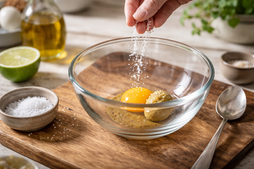 - Metti il tuorlo in una ciotola e aggiungi il sale e la senape.