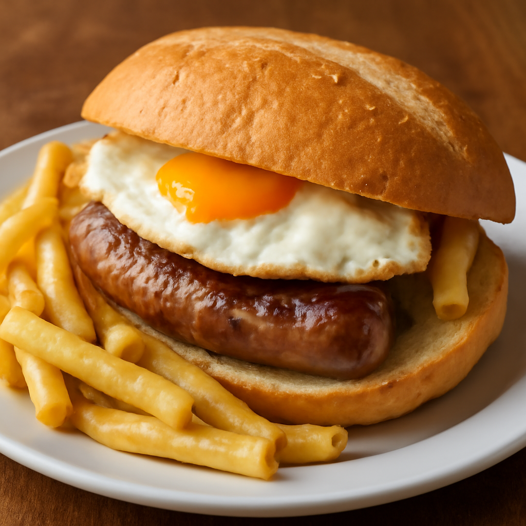 - 6.Farcisci il panino con la salsiccia, l'uovo e servi con le patatine fritte a lato.1 pezziUuova1 pezziSsalsiccia curata