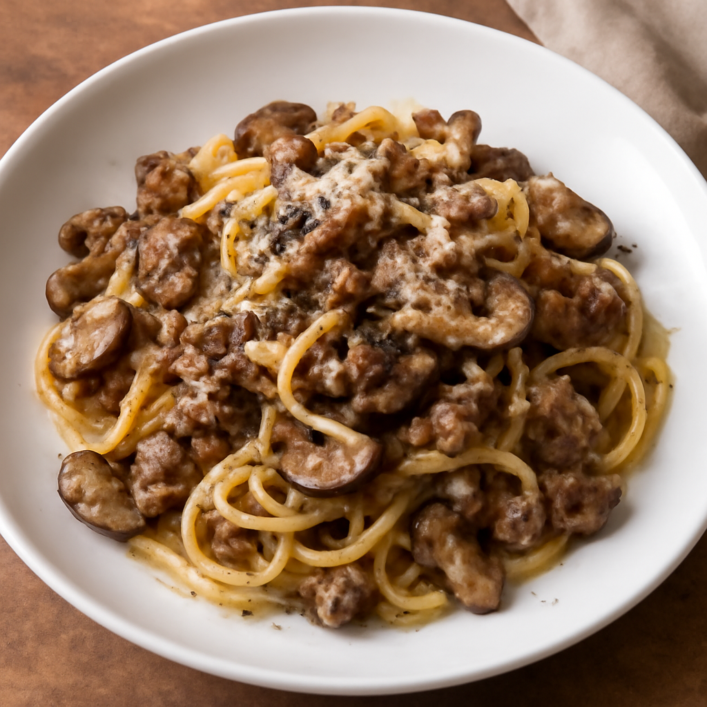 - 9.Salta la pasta nella padella con il condimento di funghi e salsiccia.60 grammiSsalsiccia di cinghiale80 grammiFfunghi champignon