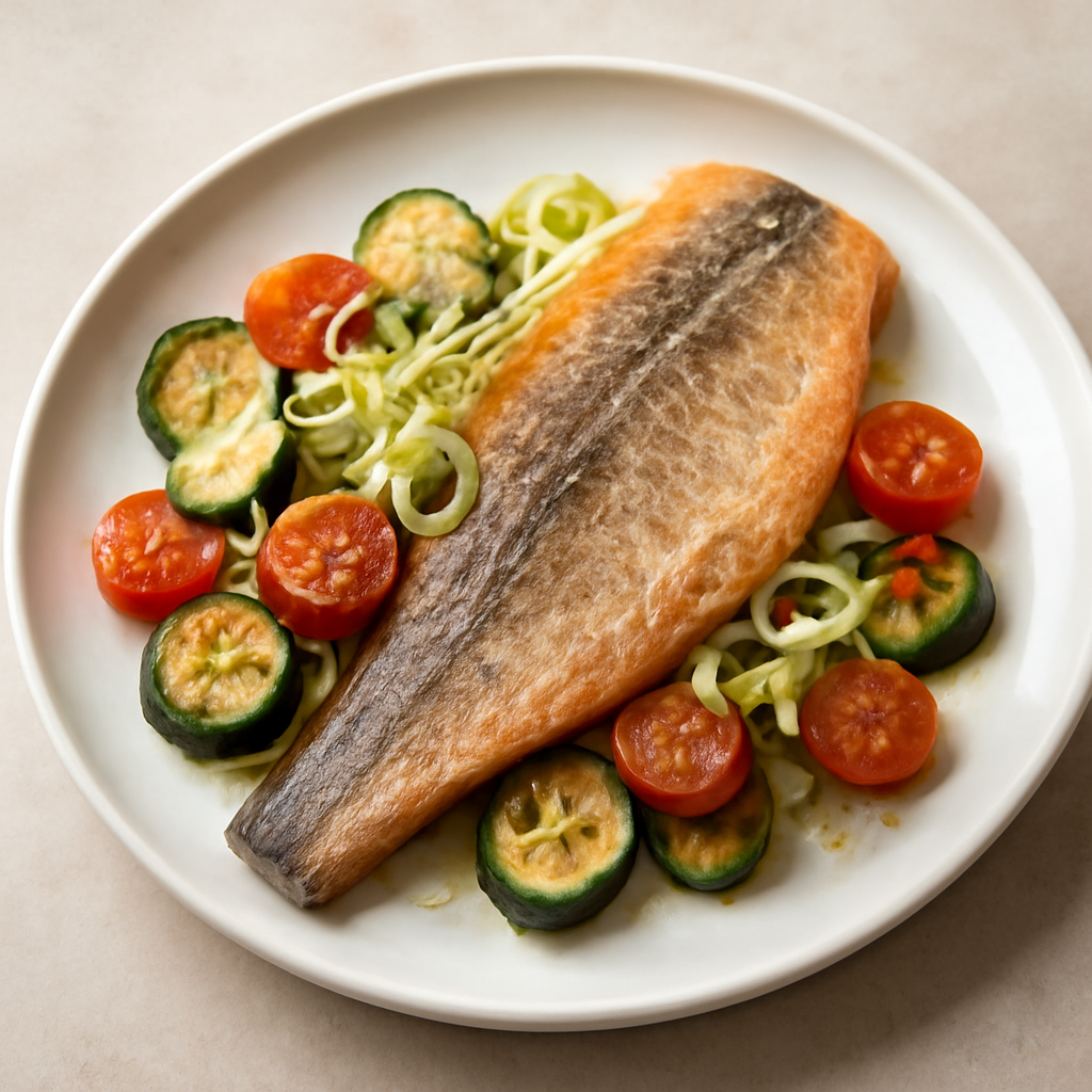 - 11.Servi il filetto di trota con le verdure saltate.150 grammiFfiletto di trota