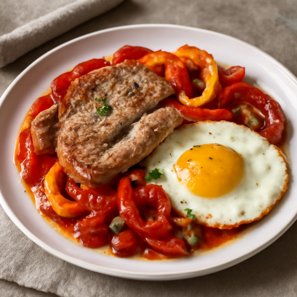 - 7.Servi la fettina di suino con le verdure e l'uovo sopra, aggiustando di sale e pepe se necessario.1 pezziFfettina di suino1 pezziUuovo1 pizzichiSsale1 pizzichiPpepe nero