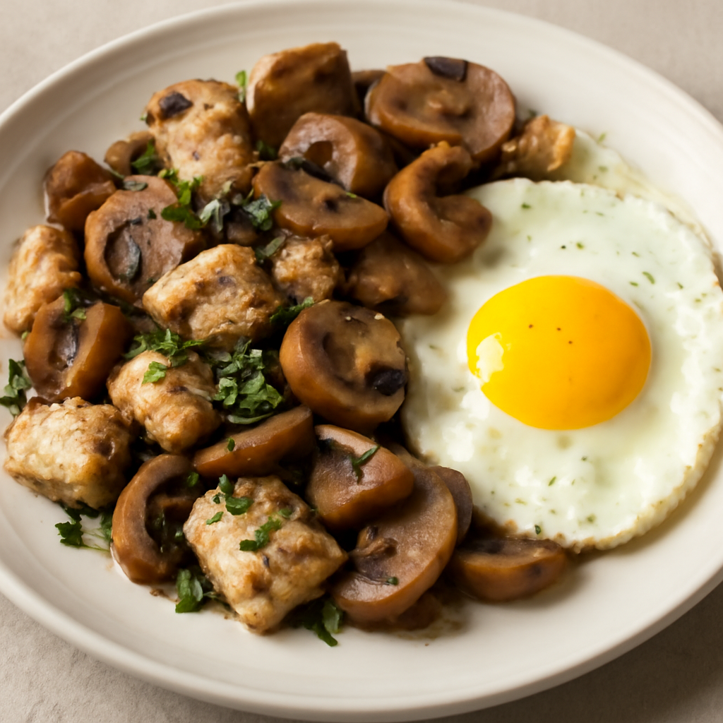 - 12.Servi il pollo trifolato ai funghi con l'uovo sodo a spicchi sopra.80 grammiFfunghi champignon1 pezziUuovo
