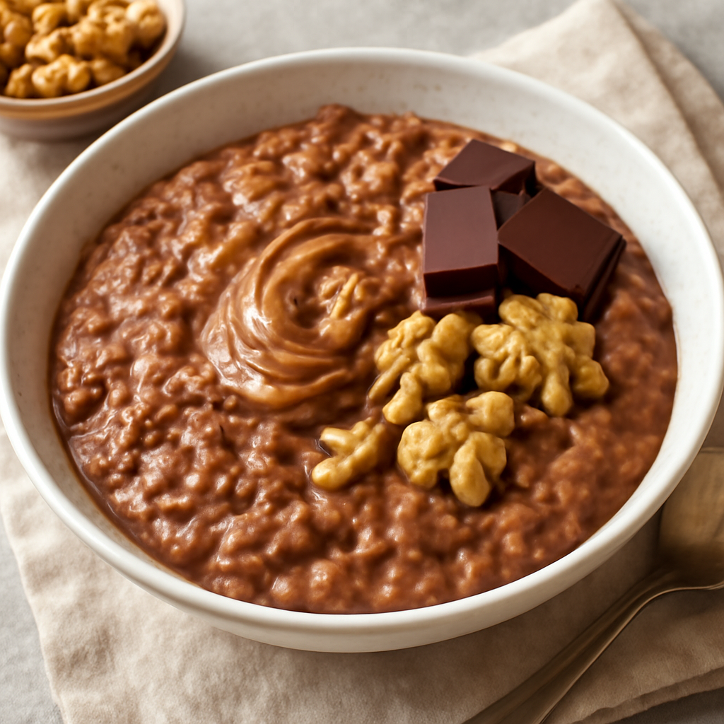 Porridge proteico al cacao con cioccolato fondente, nocciolata e noci