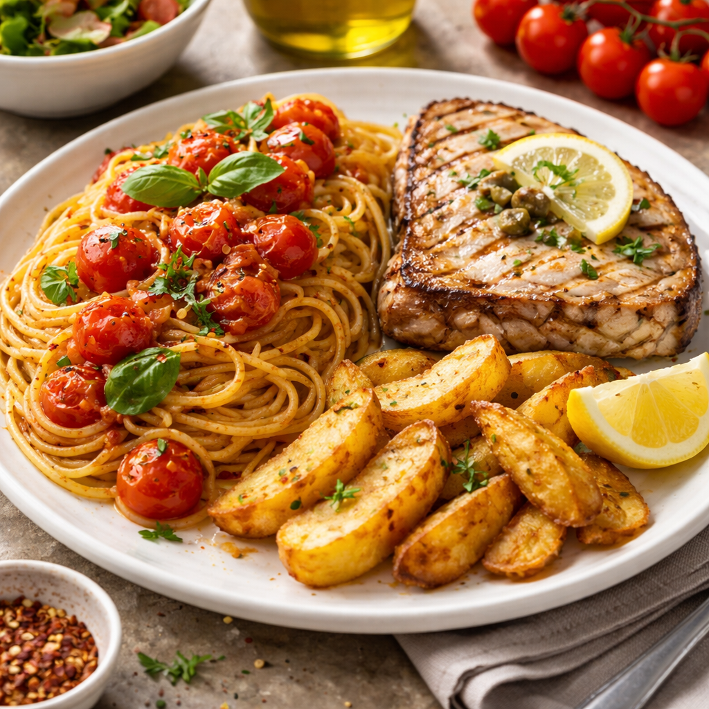 Pasta con sugo di pomodorini e trancio di pesce spada