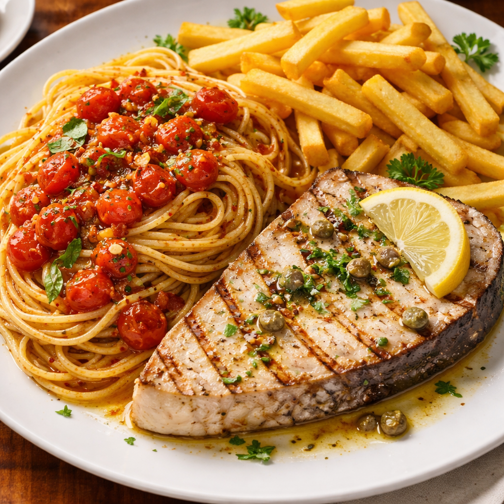 Pasta con sugo di pomodorini e trancio di pesce spada