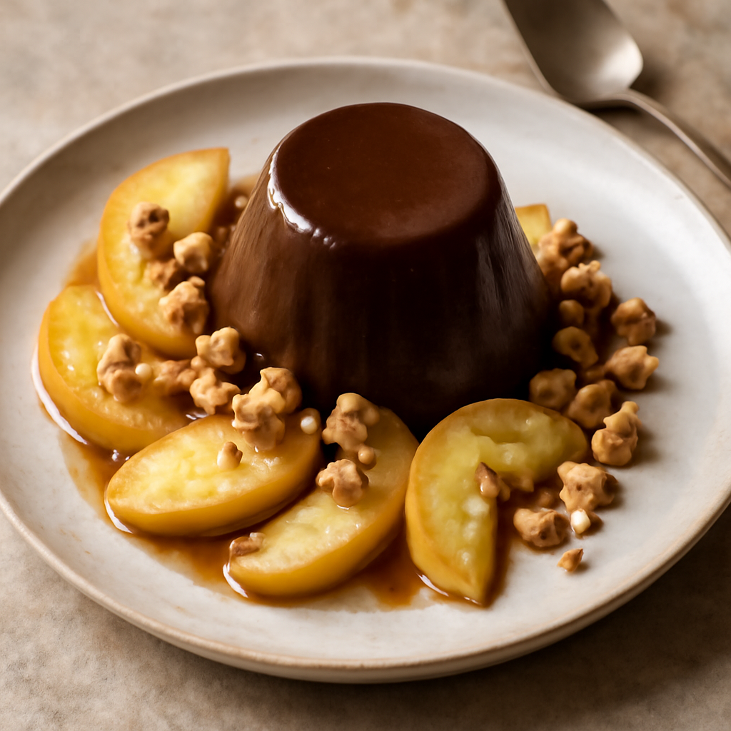 - 7.Distribuisci i cubetti di mela e le nocciole tritate sopra il budino.1 pezziMmela10 grammiNnocciole
