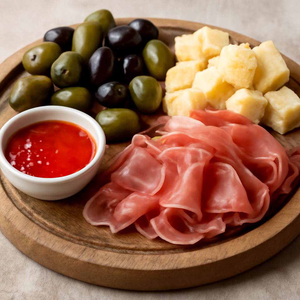 Tagliere sfizioso con olive, parmigiano, affettato e salsa piccante