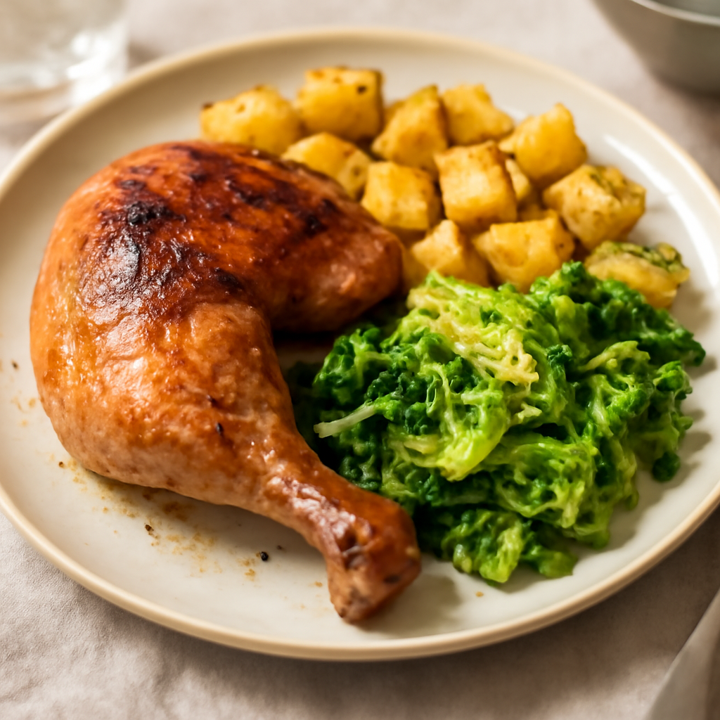 - 4.Disponi l'anca di pollo in una teglia, aggiungi le patate e il cavolo verza intorno.1 pezziAanca di pollo200 grammiPpatate100 grammiCcavolo verza