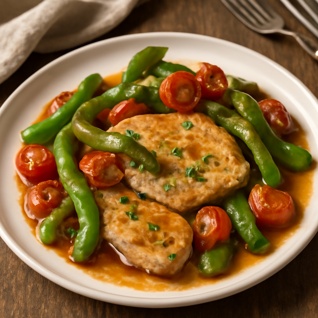 - 9.Servi la fettina di maiale con i peperoni e i pomodorini caldi.1 pezziFfettina di maiale1 pezziPpeperone verde5 pezziPpomodorini
