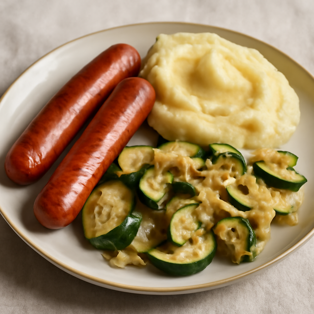 Wurstel con purè di patate, zucchine e cipolle al formaggio