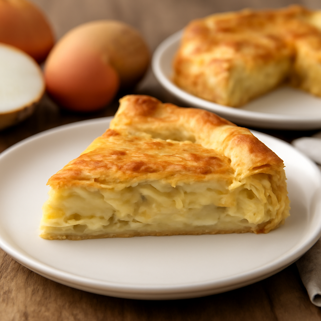 Tortino di pasta sfoglia con patate, cipolla, uova e pecorino