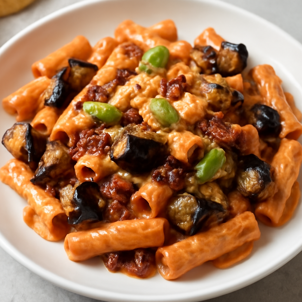 Pasta cremosa al pomodoro con melanzane e pomodori secchi
