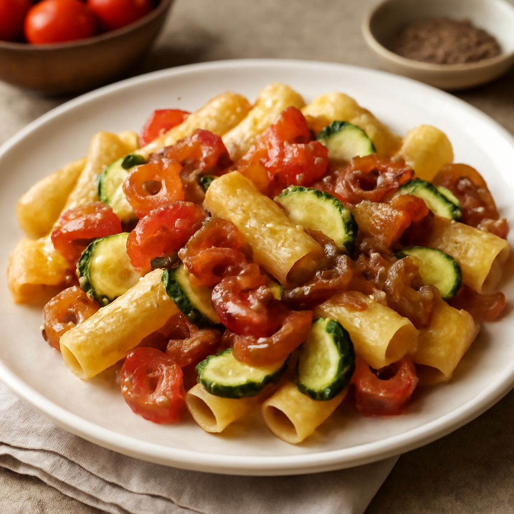 Pasta con pomodorini, guanciale e zucchine