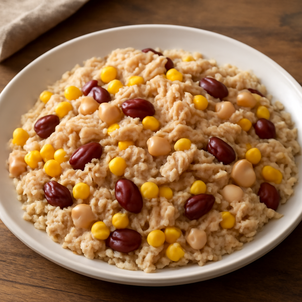 - 4.Aggiungi i ceci cotti, il mais sgocciolato, il tonno sgocciolato e i fagioli borlotti.40 grammiCceci cotti30 grammiMmais in scatola50 grammiTtonno sott'olio sgocciolato30 grammiFfagioli borlotti cotti