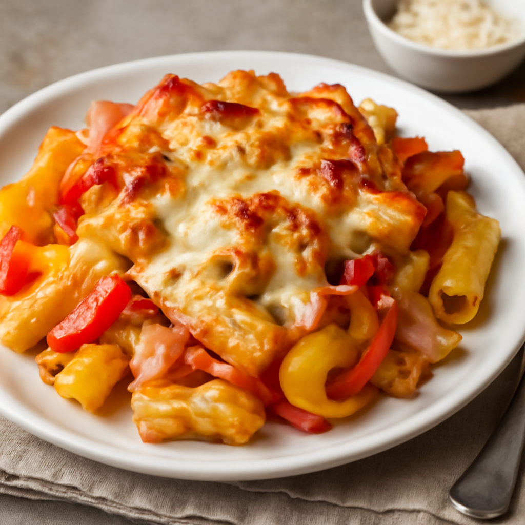 Pasta al forno con peperoni, formaggi e prosciutto