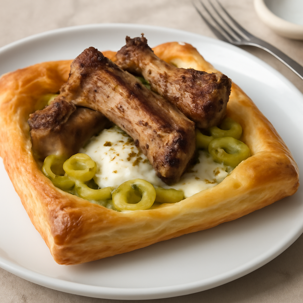 Tortino di pasta sfoglia con costine, porri e mozzarella