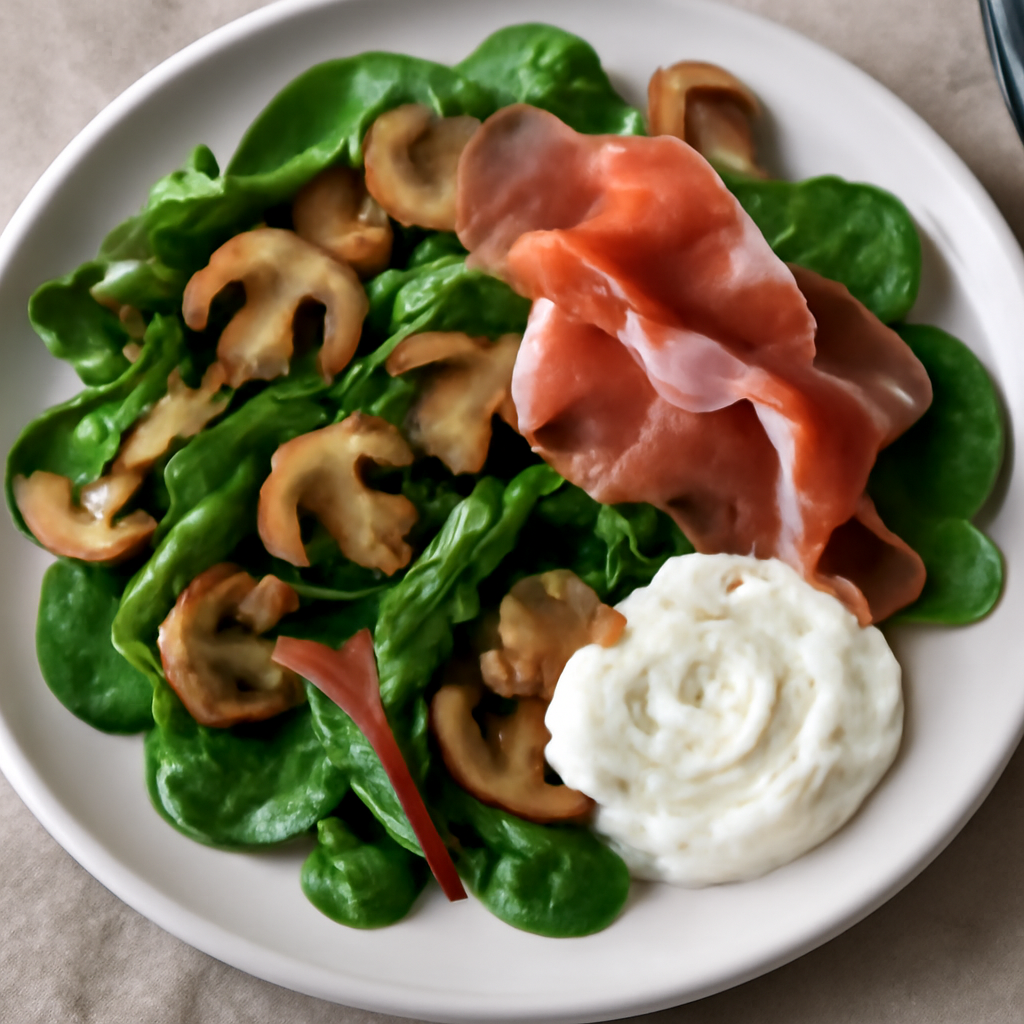 Insalata tiepida di spinaci, bietole, funghi e prosciutto crudo con crema di Philadelphia e yogurt