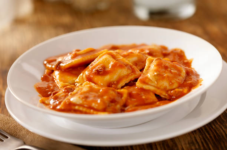 Un piatto che racchiude l’essenza della tradizione italiana, i Ravioli al pomodoro sono una celebrazione di sapori autentici e genuini. Ogni raviolo, plasmato con maestria a mano, custodisce un ripieno morbido e delicato, spesso a base di ricotta fresca e spinaci, che si fonde armoniosamente con la pasta sottile e vellutata. Una volta cotti, i ravioli vengono avvolti da una generosa salsa al pomodoro, preparata con pomodori maturi, cipolla dolce, un filo d’olio extravergine d’oliva e un profumo discreto di basilico fresco. La salsa, densa e avvolgente, esalta la dolcezza del ripieno senza sovrastarlo, creando un equilibrio perfetto tra acidità e morbidezza. Il piatto viene completato da una spolverata di Parmigiano Reggiano grattugiato al momento, che aggiunge una nota sapida e raffinata. I Ravioli al pomodoro sono molto più di un semplice primo: sono un invito a rallentare e a godere dei piccoli piaceri della vita, un viaggio sensoriale tra colori vivaci, profumi avvolgenti e sapori che risvegliano ricordi di domeniche in famiglia. Un classico intramontabile che conquista il palato e il cuore.