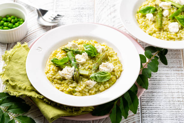- Dopo circa 10 minuti, aggiungi gli asparagi tagliati a pezzetti e i piselli.