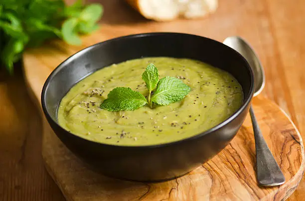 - Aggiungi le foglie di menta e frulla il tutto con un frullatore a immersione fino a ottenere una consistenza vellutata.
