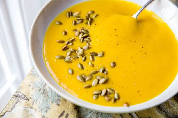 - Servire la vellutata calda, guarnita con i semi di zucca croccanti.